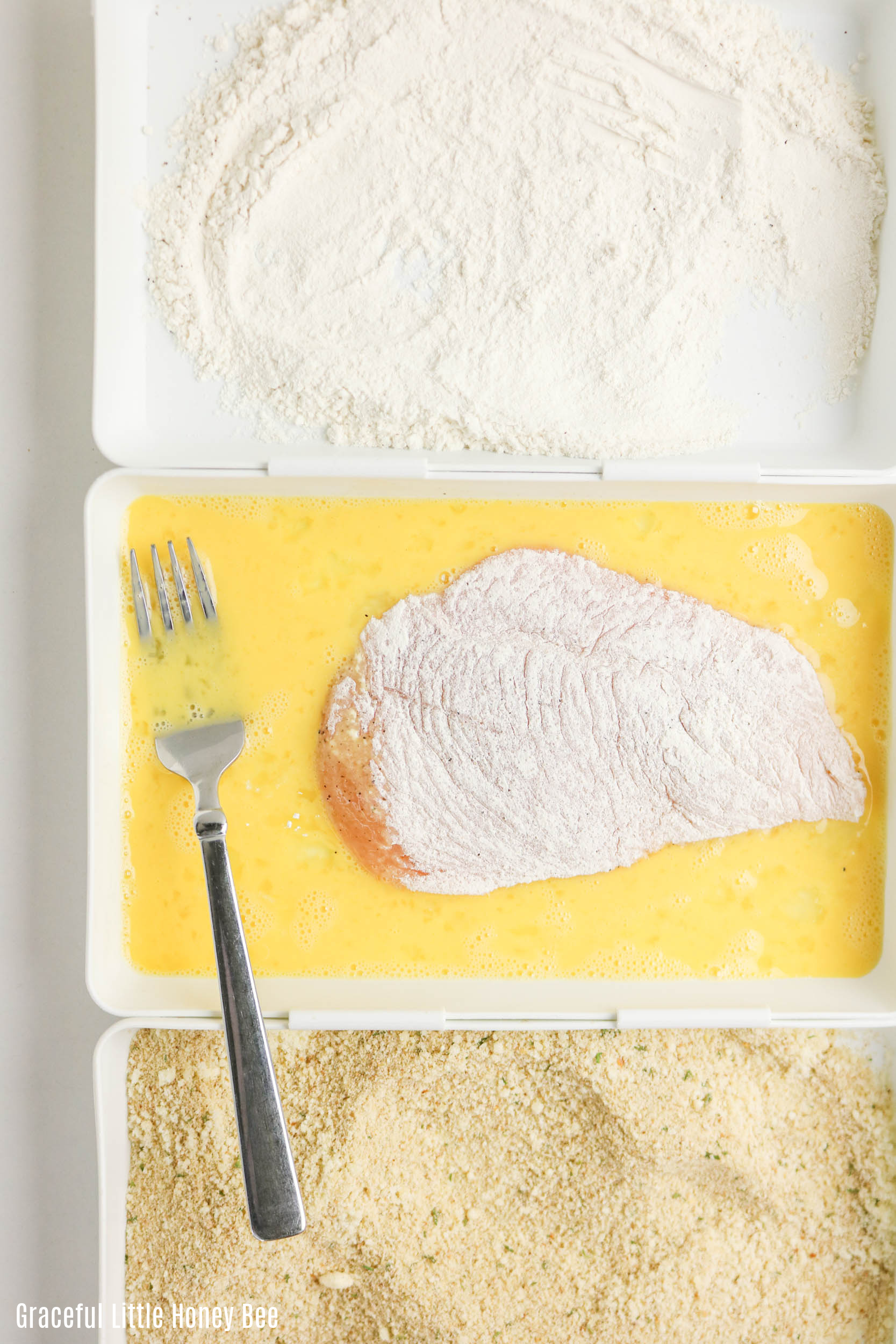 - Dredge in flour, dip in eggs, then coat with breadcrumbs mixed with 1/4 cup Parmesan.