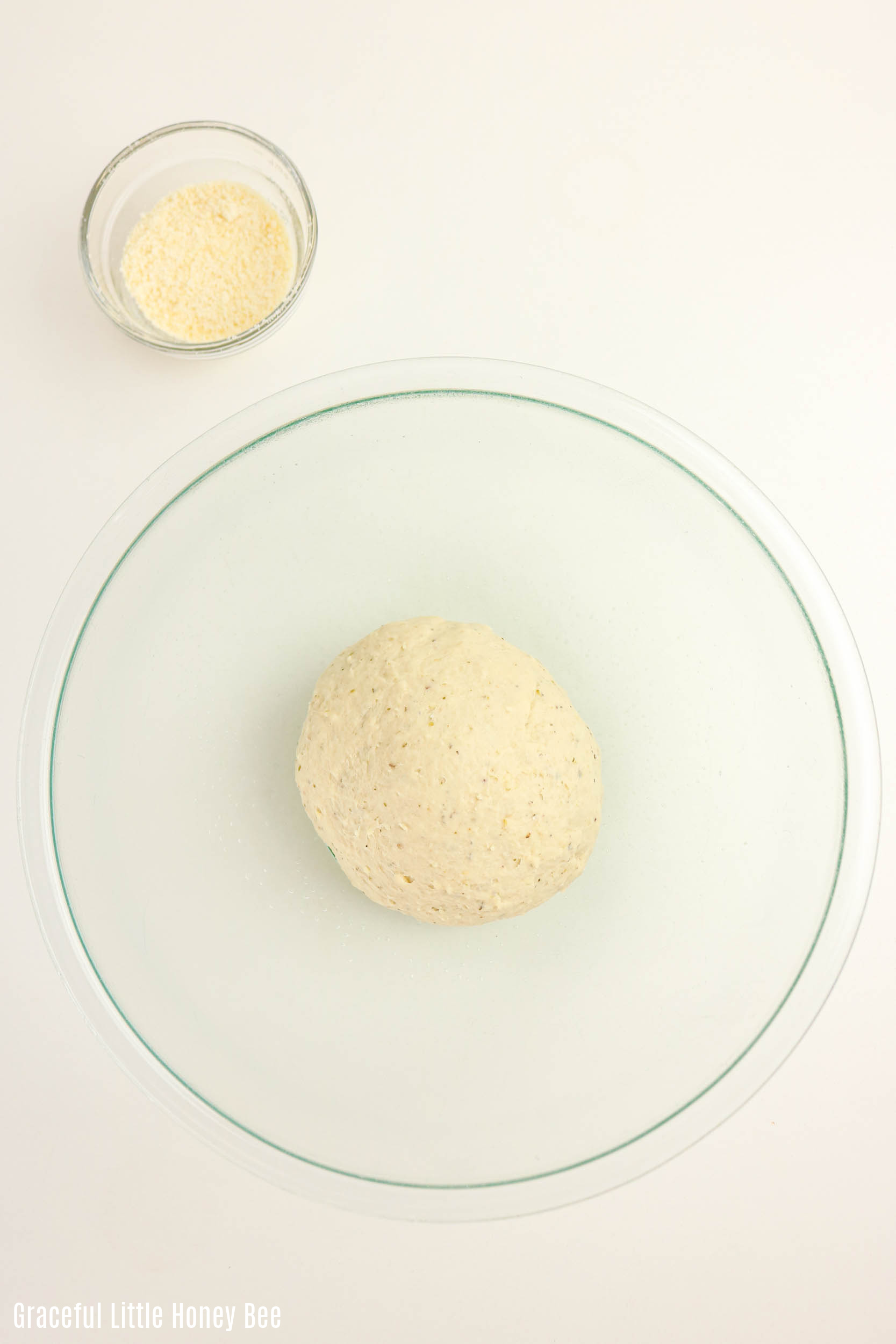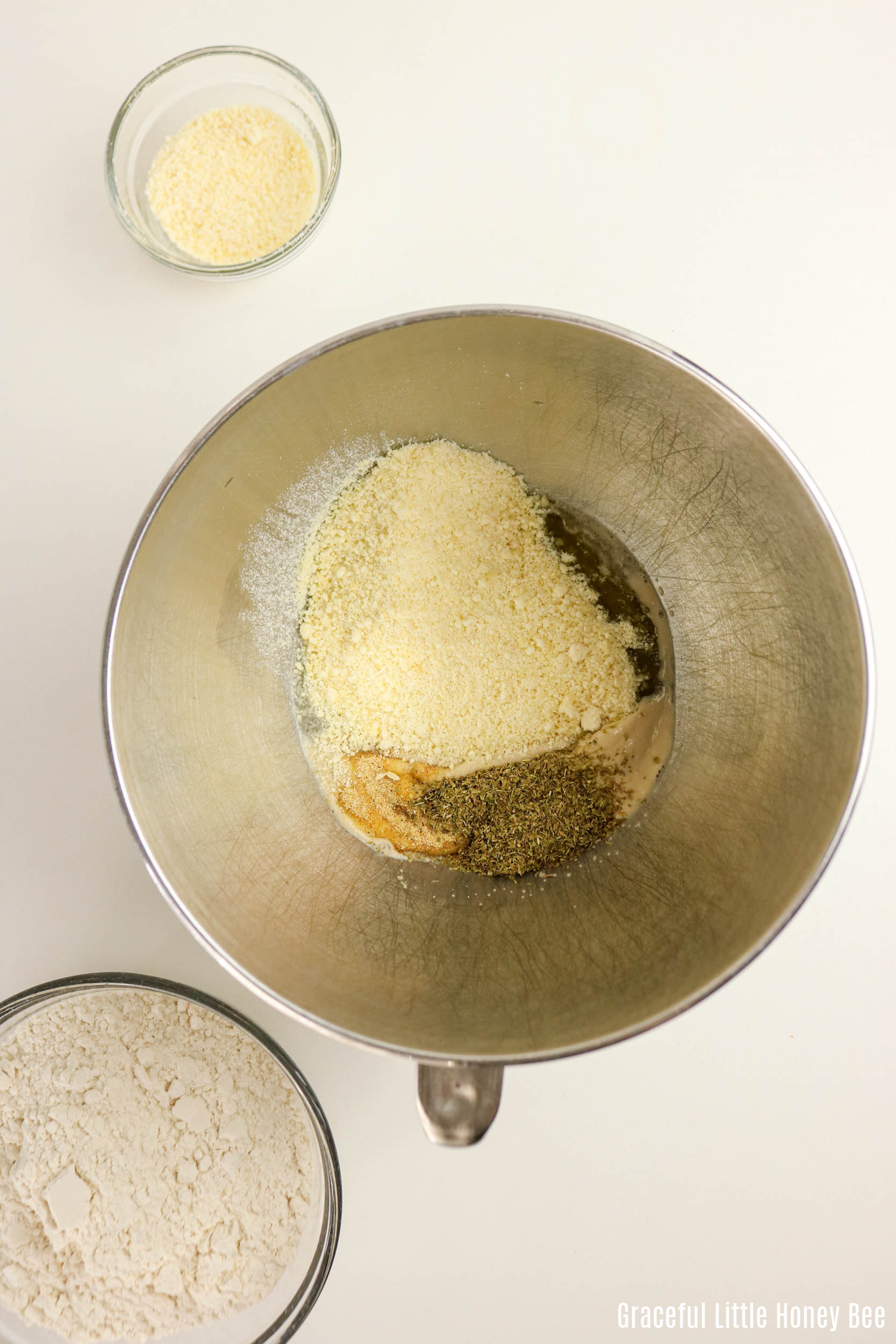 - Add olive oil, salt, oregano, garlic powder, and ¾ cup of the Parmesan.